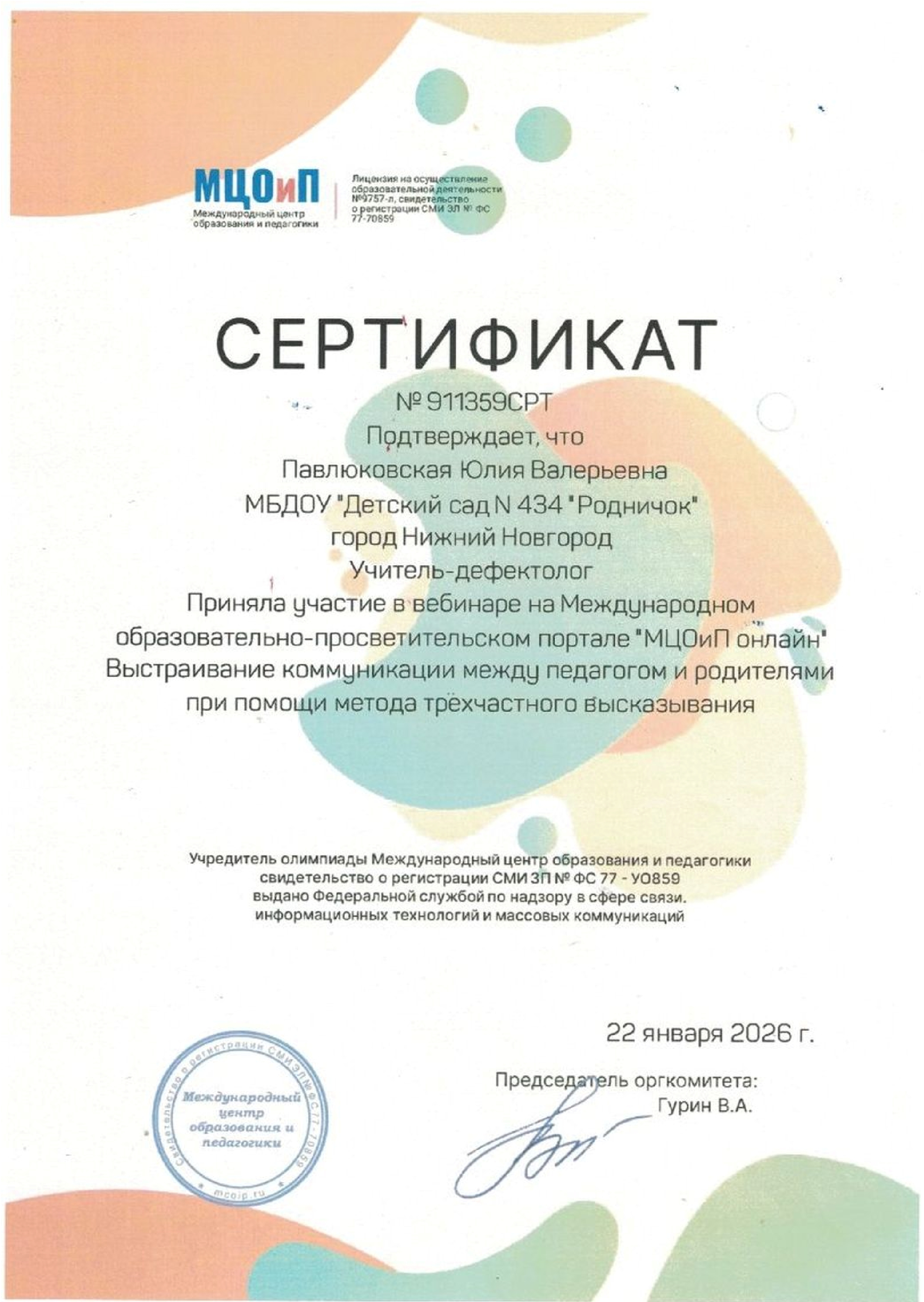 Образование: высшееГОУ ВПО "Нижегородский государственный педагогический университет", 2005г.Квалификация: Специальный психолог и учитель-логопедСпециальность:"Специальная психология" с дополнительной специальностью "Логопедия"